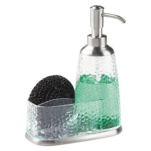 mDesign soap dispenser is a refillable product that keeps the soap within reach as you work in your kitchen sinks. It is suitable for holding soaps, hand lotions, essential oils, and sanitizers. The package includes sponges, brushes, and scrubbers. The dispenser has a 13-ounce capacity, which is easy to refill.