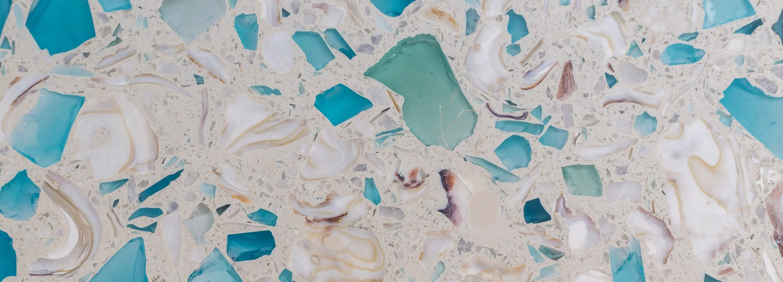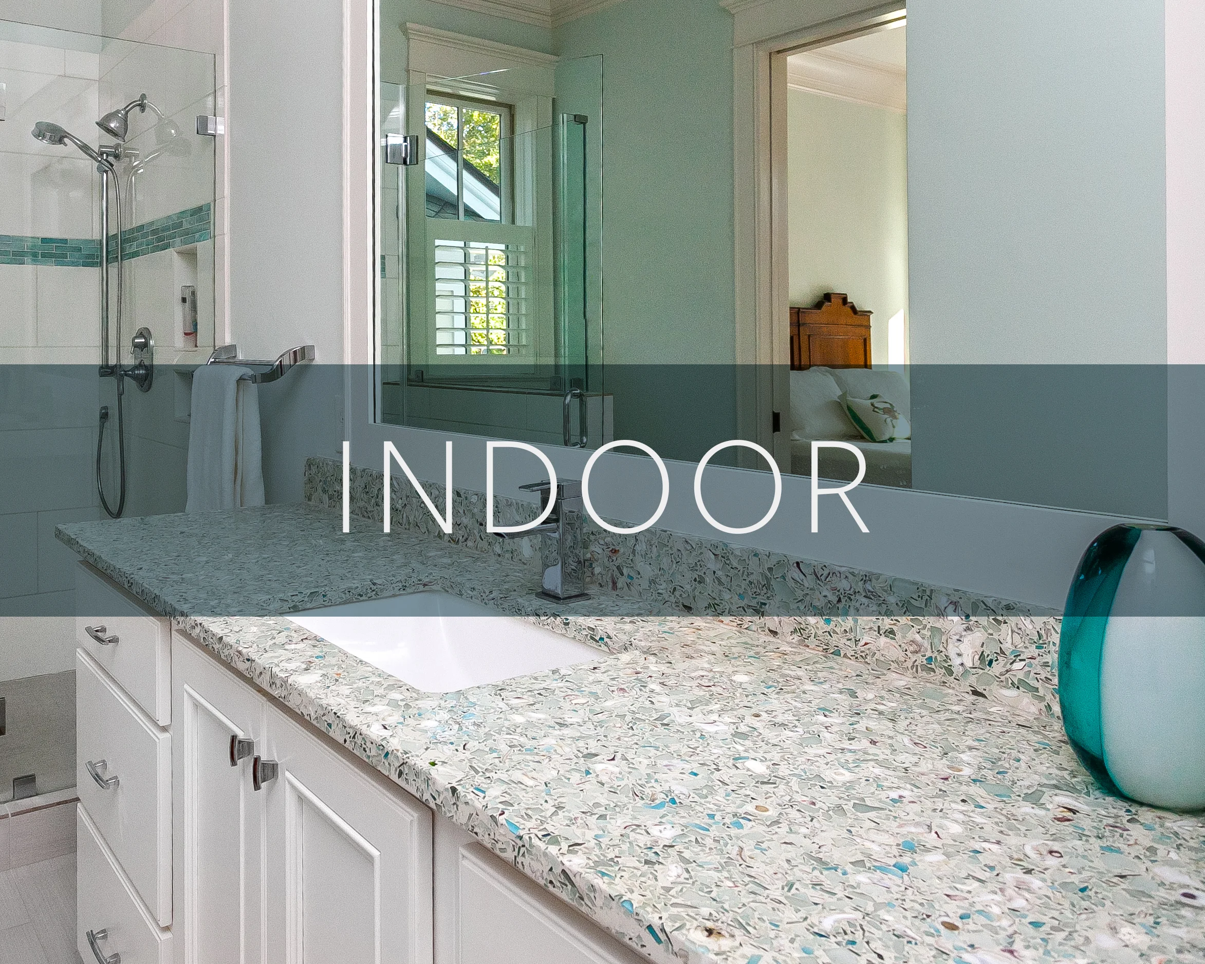 A Recycled Glass Surface from Curava in the color Savaii was selected for the vanity countertop and was a unique way to include natural elements that resemble the look of sea glass into this coastal space.