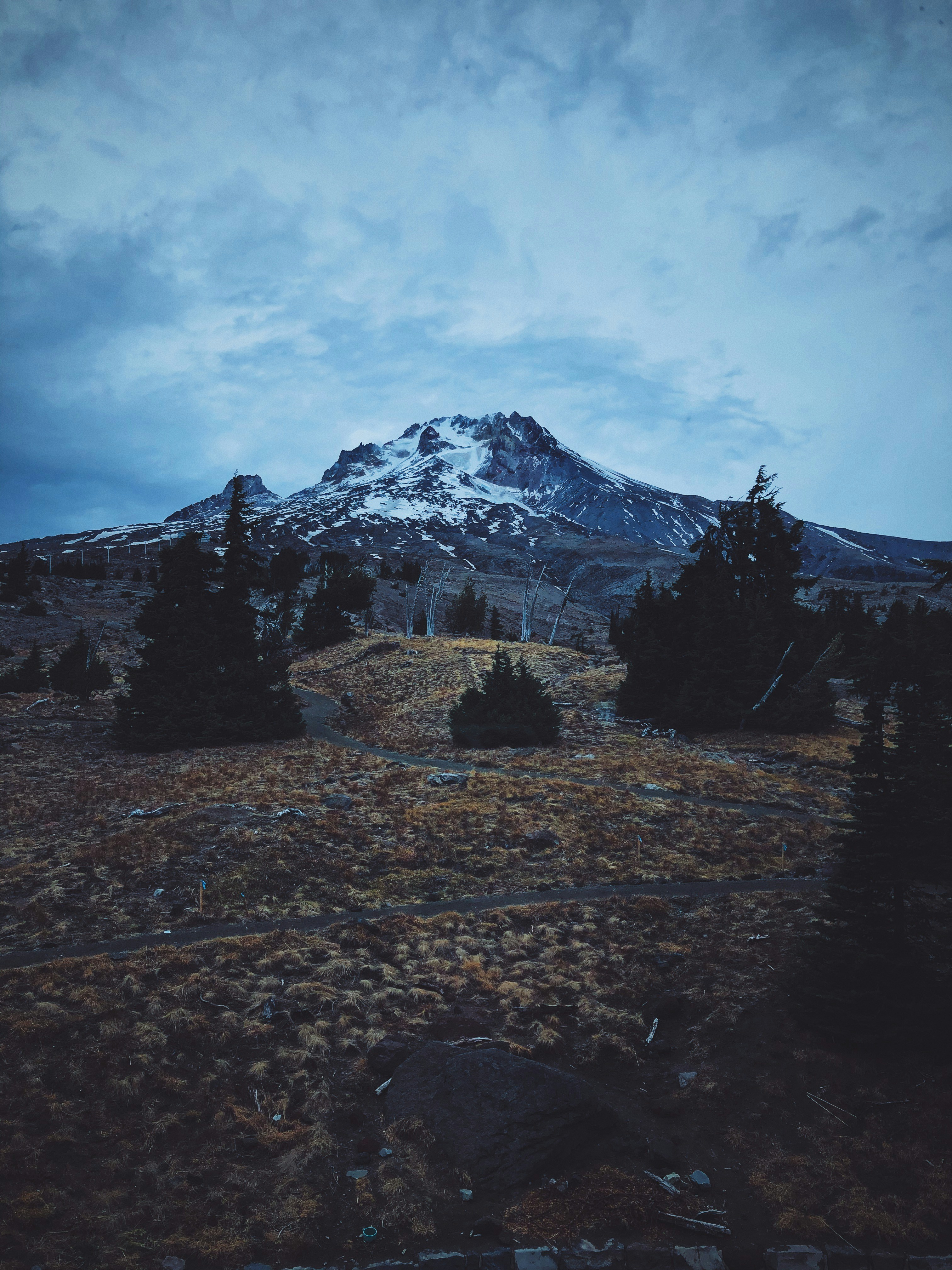 A moody portrait of a snow covered mountain with autumn leaves and evergreen trees in the foreground.