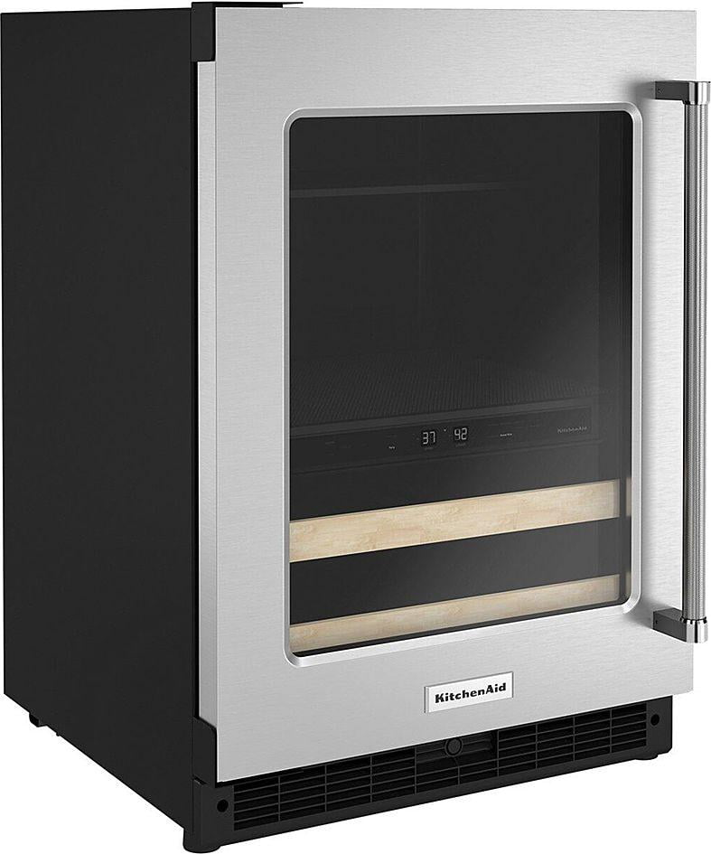 KURL314KBS KitchenAid 24" Undercounter Refrigerator with Glass Door and Shelves with Metallic Accents - Left Hinge - Black Stainless Steel …Hinges - Provides a built-in look within a standard 24" base cabinet, so your style stands out, not the appliance. Hidden hinges allow the beverage center door to sit flush with surrounding cabinet fronts when closed yet easily swing open a full 90 degrees.