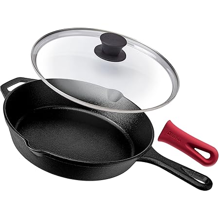 Cast Iron Skillet with Lid | Large 12” Frying Pan with Glass Lid & Silicone Handle for Oven, Induction, Cooking, Pizza Cast iron skillets are essential to any kitchen. They come in numerous sizes and shapes. They are durable and create a nice crust on meats. Cast iron skillets also store heat like no other pan even after they cool down.