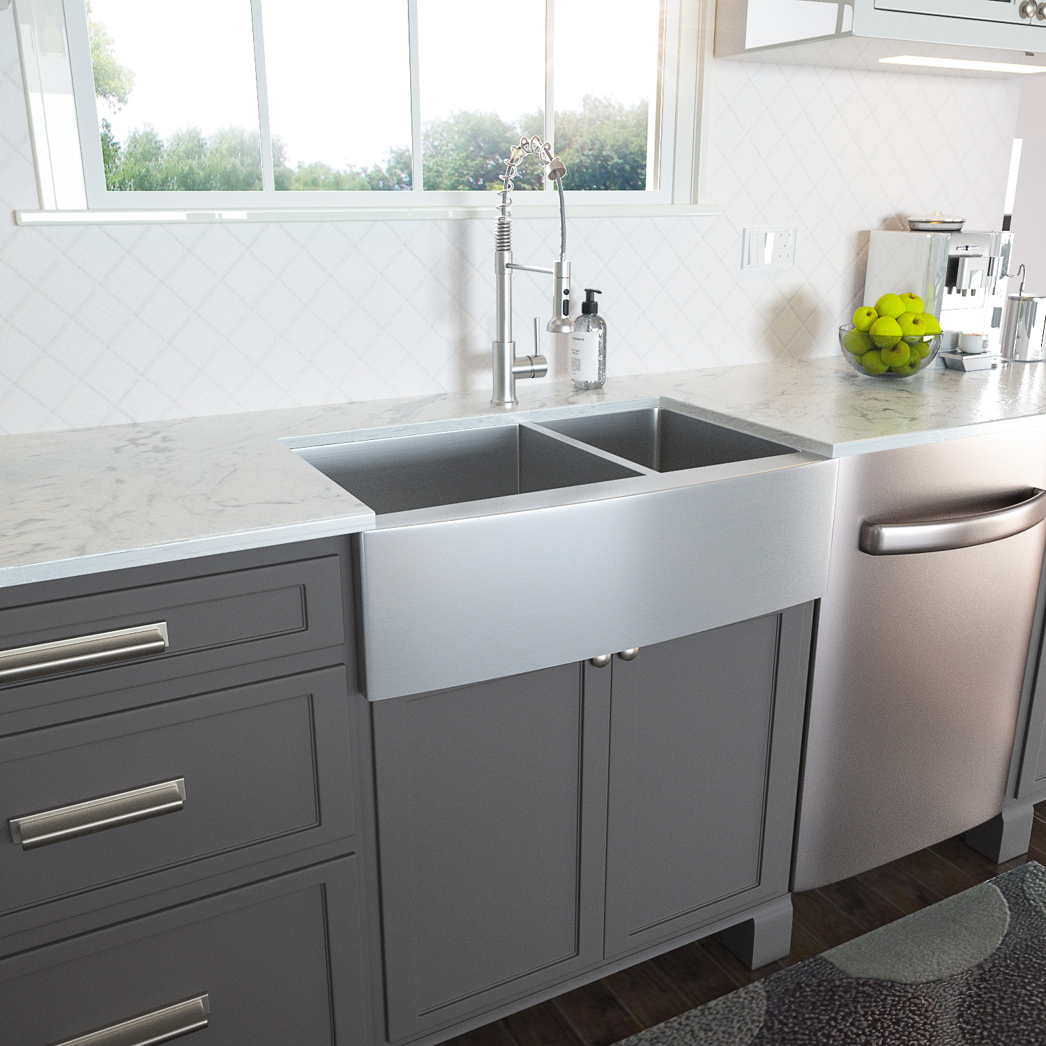 Although subway tile works with any style, there is something so special about the contrast of white subway tile in a farmhouse kitchen. Line the wall above your stovetop or farmhouse sink for a streamlined and cohesive backsplash. Pair your kitchen backsplash with a natural stone or butcher block countertop for an earthy and rustic contrast. What is the price range for Copper Farmhouse Kitchen Sinks? The average price for Copper Farmhouse Kitchen Sinks ranges from $500 to $4,000. What is the best-rated product in Copper Farmhouse Kitchen Sinks? The best-rated product in Copper Farmhouse Kitchen Sinks is the Bernini Farmhouse Apron Front Handmade Pure Solid Copper 30 in. Double Bowl ... Whitehaven Undermount Farmhouse Apron Front Cast Iron 36 in. Single Bowl Kitchen Sink in White The Whitehaven apron-front kitchen sink features The Whitehaven apron-front kitchen sink features a streamlined and versatile farmhouse style to complement any decor. A large single basin accommodates large pots and pans, while the sloped bottom helps with draining … Gravena Undermount 4375-in x 23-in Brushed Stainless Steel Double Equal Bowl 4-Hole Corner Install Kitchen Sink. Model # RVH8400. Find My Store. for pricing and availability. 6. 6. Elkay. Dayton Drop-In 31.875-in x 31.875-in Elite Satin Double Equal Bowl 3-Hole Corner Install Kitchen Sink. Model # DE217323.