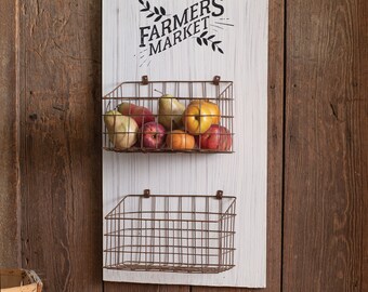 Purchasing the right Wall Mounted Produce Basket can be a dauting task. Wall-mounted rack with 2 metal storage baskets and distressed wood back panel. Distressed torched wood and rustic metal baskets add a contemporary feel to your kitchen or bathroom space.