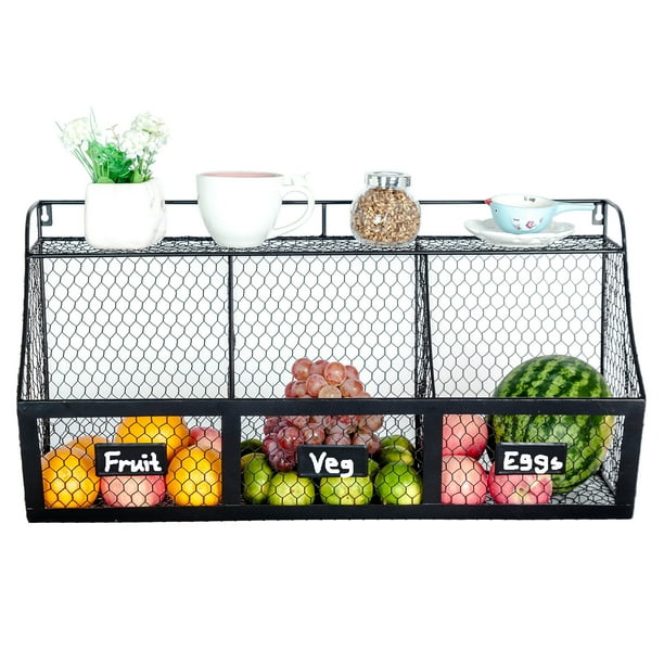 3 Compartment Kitchen Basket Large Wall Mount Metal Storage Hanging Fruit Organizer Produce Wire Baskets Rack Bin Black