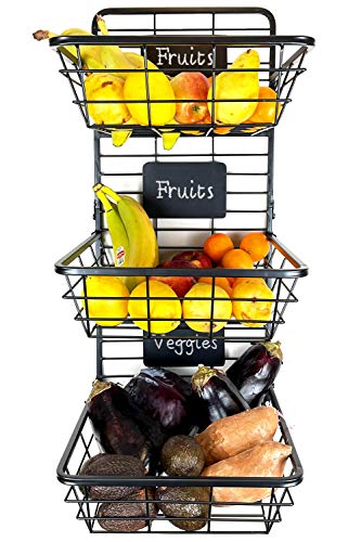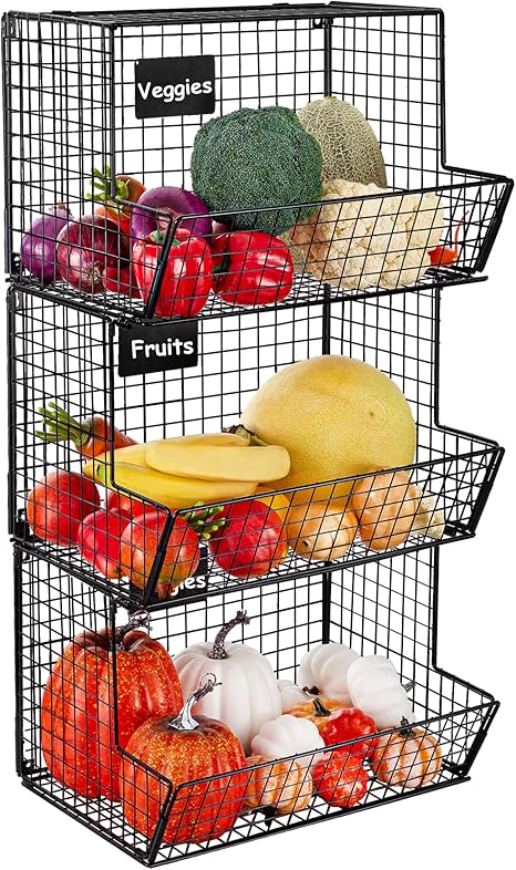Wall Mounted Wire Basket Hanging Fruit Basket, 3 Tier Kitchen Storage Bins Fruit Vegetable and Pantry Organizier Stand, Produce Rack, Black,