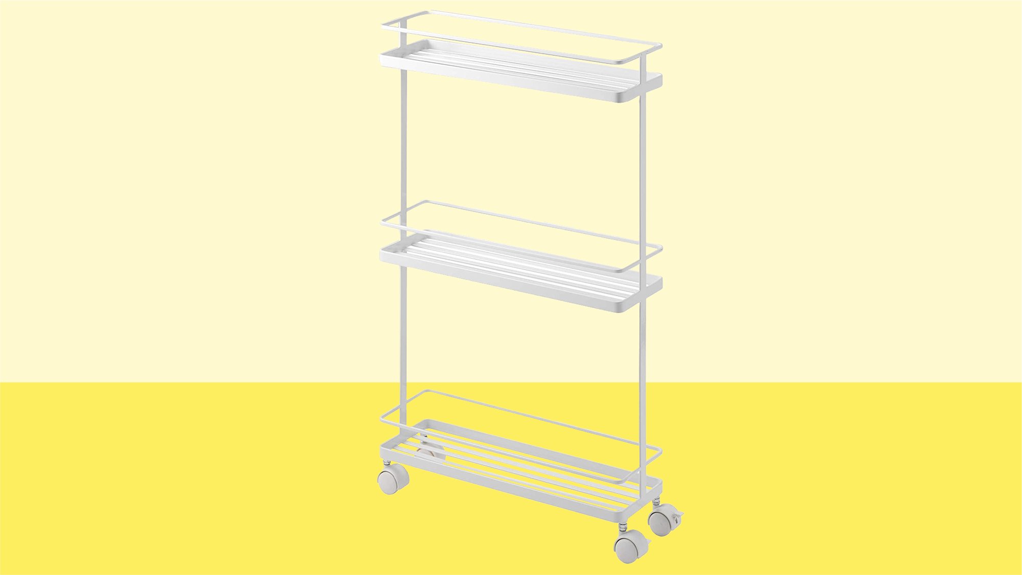 The 3-Tier Slim Rolling Cart from Hastings Home has a narrow 5-inch wide design to fit in small spaces like in between the washer and dryer, next to the toilet, or next to the refrigerator.