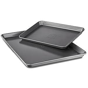 The Inexpensive Cookie Sheet Pan. This pan is very affordable to purchase and is protected by a 10-year warranty. The pan is constructed of aluminized steel that heats evenly and will not warp overtime. The pan is also coated in a non-stick finish that allows food to be released easily. KitchenAid Nonstick Cookie Slider, 13x18-Inch $24.99$21.95 Amazon Buy Now Made of heavy-duty aluminized steel and a premium nonstick coating, this sheet pan will not only help with cookie release, but it will also be a sturdy, reliable addition to your bakeware collection. The nonstick surface is so smooth, that cookies will seamlessly slide off.