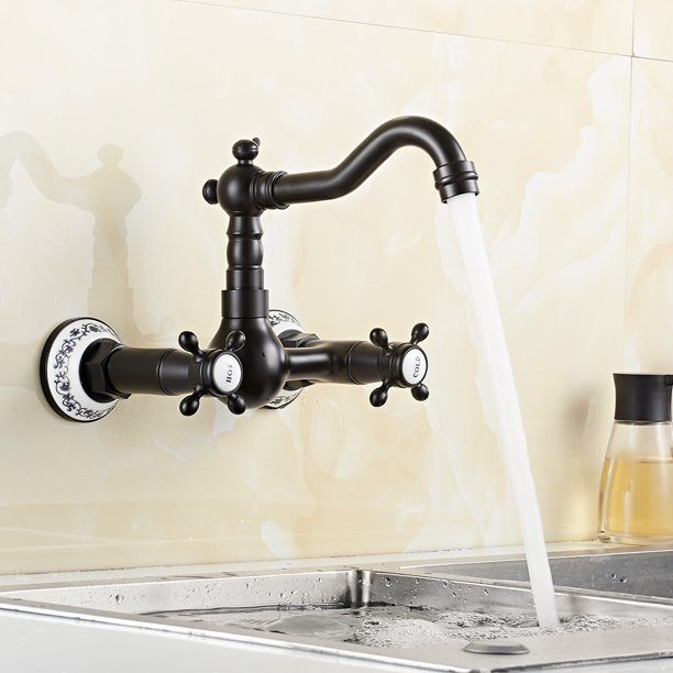 Kitchen sink faucets with touch-clean spray holes allow you to easily wipe away calcium and lime build-up with the touch of a finger. Product Type: Single Handle Kitchen Faucet. Overall Faucet Height - Top to Bottom: 15.5''. Primary Material: Brass. Spout Reach - Front to Back: 9''. Spout Height - Top to Bottom: 15.5''. Airuida Wall Mount Kitchen Faucet Antique Brass Tap for Kitchen Sink 6 Inch(15cm) Spout Reach 6 Inch Center Adjustable Center Double Cross Handles Hot and Cold Water Mixer Tap 360 Rotatable Faucet [Material]: Refined brass material construction, advance antique brass finish resist corrosion and tarnishing, anti-rust.