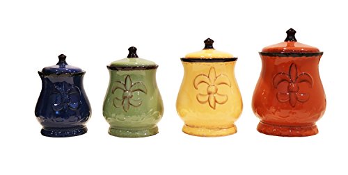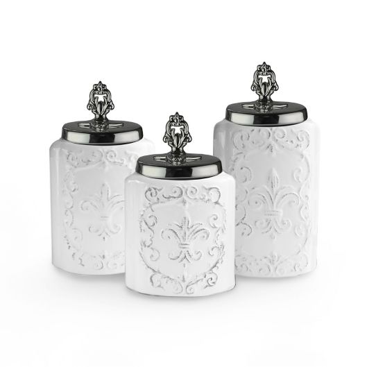 Tuscany Colorful Hand Painted Fleur De Lis Canisters, Set of 4, 82001 By ACK. 3.5 out of 5 stars. (3) 3 product ratings - Tuscany Colorful Hand Painted Fleur De Lis Canisters, Set of 4, 82001 By ACK. $101.99. American Atelier 3-Piece White Fleur de Lis Canister Set. 4.5 out of 5 stars530. American Atelier Bianca Leaf Canister Set 3-Piece Ceramic Jars in 20oz, 48oz and 80oz Chic Design With Lids for Cookies, Candy, Coffee, Flour, Sugar, Rice, Pasta, Cereal & More. 4.6 out of 5 stars397. Mud Pie 150093 Kitchen Canister (Set of 3), Fleur de Lis, White. AMAZON. Three piece set includes ceramic canisters with rubber gaskets Fleur de Lis relief pattern and metal Fleur de Lis knobs. Related Products. CONNEXITY. Old Dutch. Old Dutch International Avignon Antique Copper Etched Canister Set, 4 Piece - Brown Amazon.com: American Atelier 3-Piece White Fleur de Lis Canister Set : Home & Kitchen.