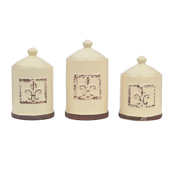 Chef 3 Piece Kitchen Canister Set Fleur De Lis Living. Wayfair North America. $37.99. CJ. "coyote_sc". Fleur De Lis Living. Tall Round Ceramic Kitchen Canister with Fleur-de-lis Finial Fleur De Lis Living Size: 20" H x 4.5" W x 6.5" D, Color: Orange. Wayfair North America. $47.99. American Atelier 3-Piece White Fleur de Lis Canister Set. 4.5 out of 5 stars 533. American Atelier Bianca Leaf Canister Set 3-Piece Ceramic Jars in 20oz, 48oz and 80oz Chic Design With Lids for Cookies, Candy, Coffee, Flour, Sugar, Rice, Pasta, Cereal & More. 4.6 out of 5 stars 410. Check out our fleur de lis canister selection for the very best in unique or custom, handmade pieces ... Colorful Fleur de lis ceramic kitchen canister set. Cream Ceramic Fleur de Lis Canisters Set of 3 - The Fleur de Lis a stylized lily composed of three petals bound together near their bases, especially known from the former royal arms of France. These counter canisters will bring a royal flair to your home.