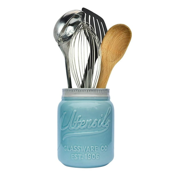 Comfify Wide Mouth Mason Jar Utensil Holder Decorative Kitchenware Organizer Crock, Chip Resistant Ceramic, Dishwasher Safe - Kitchen Caddy Aqua Blue, ...