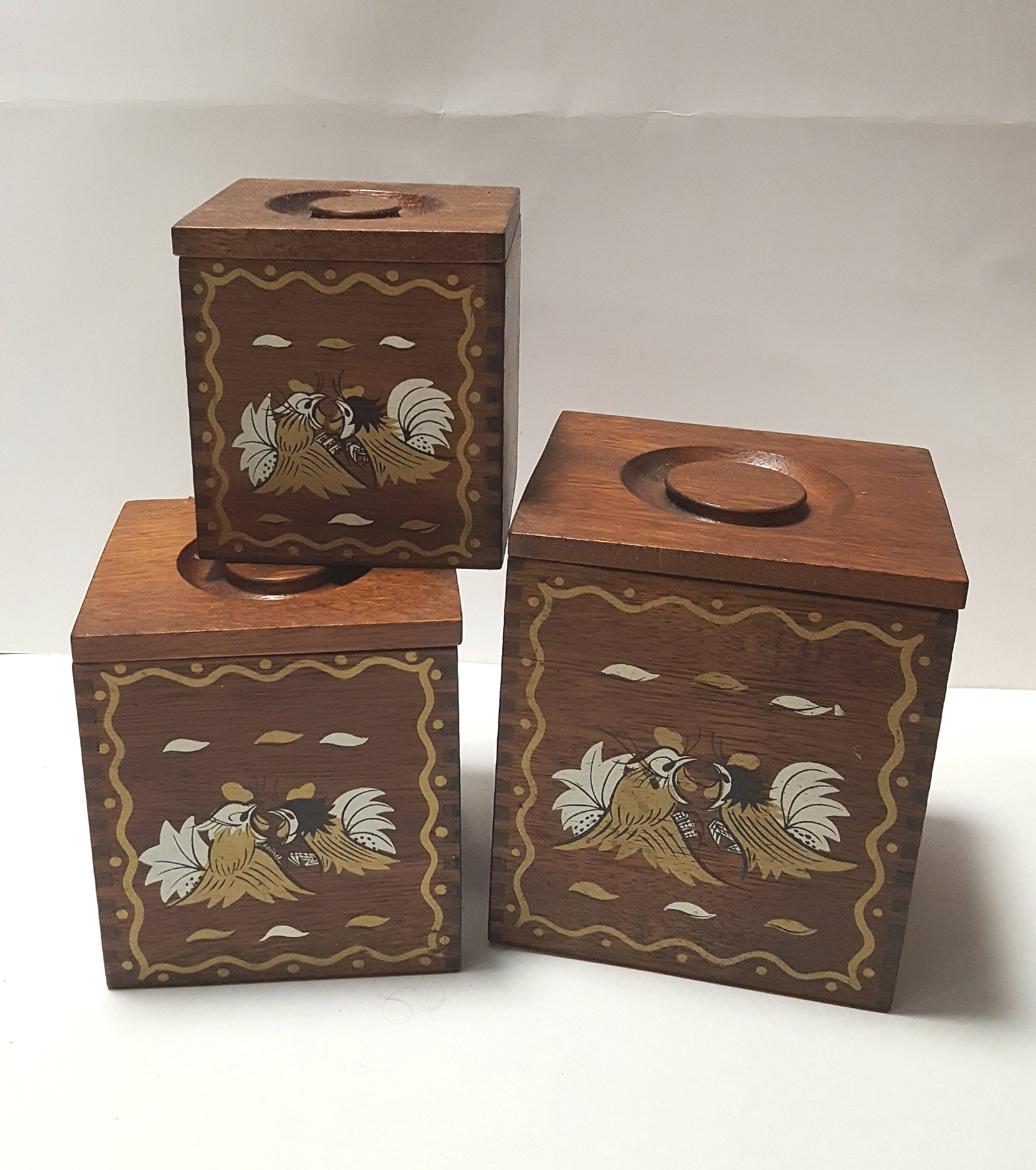Vintage wood rooster canister set, fighting roosters, vintage square wood canister sets, vintage canisters, wood canisters, square canisters