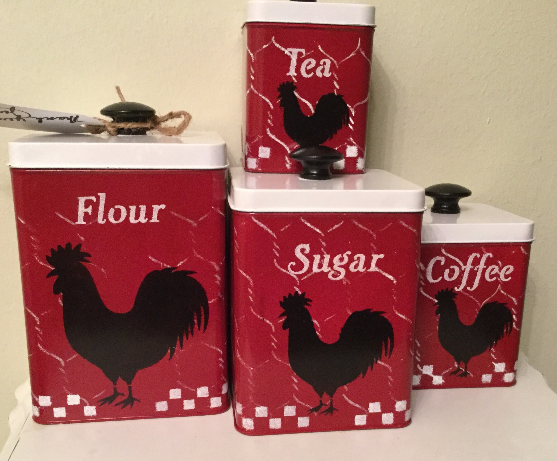Rooster Kitchen Canister Set Red Rooster Soap Dispenser | Etsy Rooster kitchen canister set, rooster soap jar, rooster utensil holder, rooster sugar and flour canisters. Rooster decor, rooster kitchen sets. farmhouse kitchen decor, farm animal kitchen canisters. My New Improved Water Resistant Triple Thick Glaze Sealant is now protecting your beautifully hand painted jars and trash cans!!