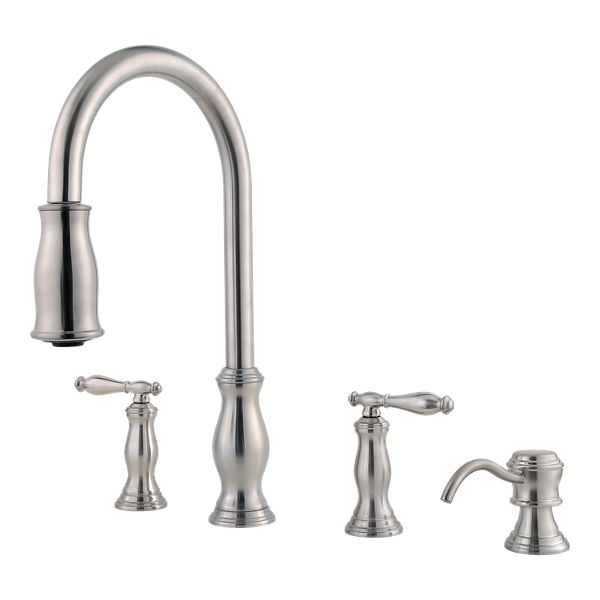 2-Handle Pull-Down Kitchen Faucet - Pfister Faucets 2-Handle Pull-Down Kitchen Faucet With Soap Dispenser Stainless Steel Model: F-531-4PAS Save for Later How can something so innovative be so stylish? Petaluma offers both with a sleek, pull out arc spray head that toggles between stream and spray, reaching every corner of the sink with style and grace. Features