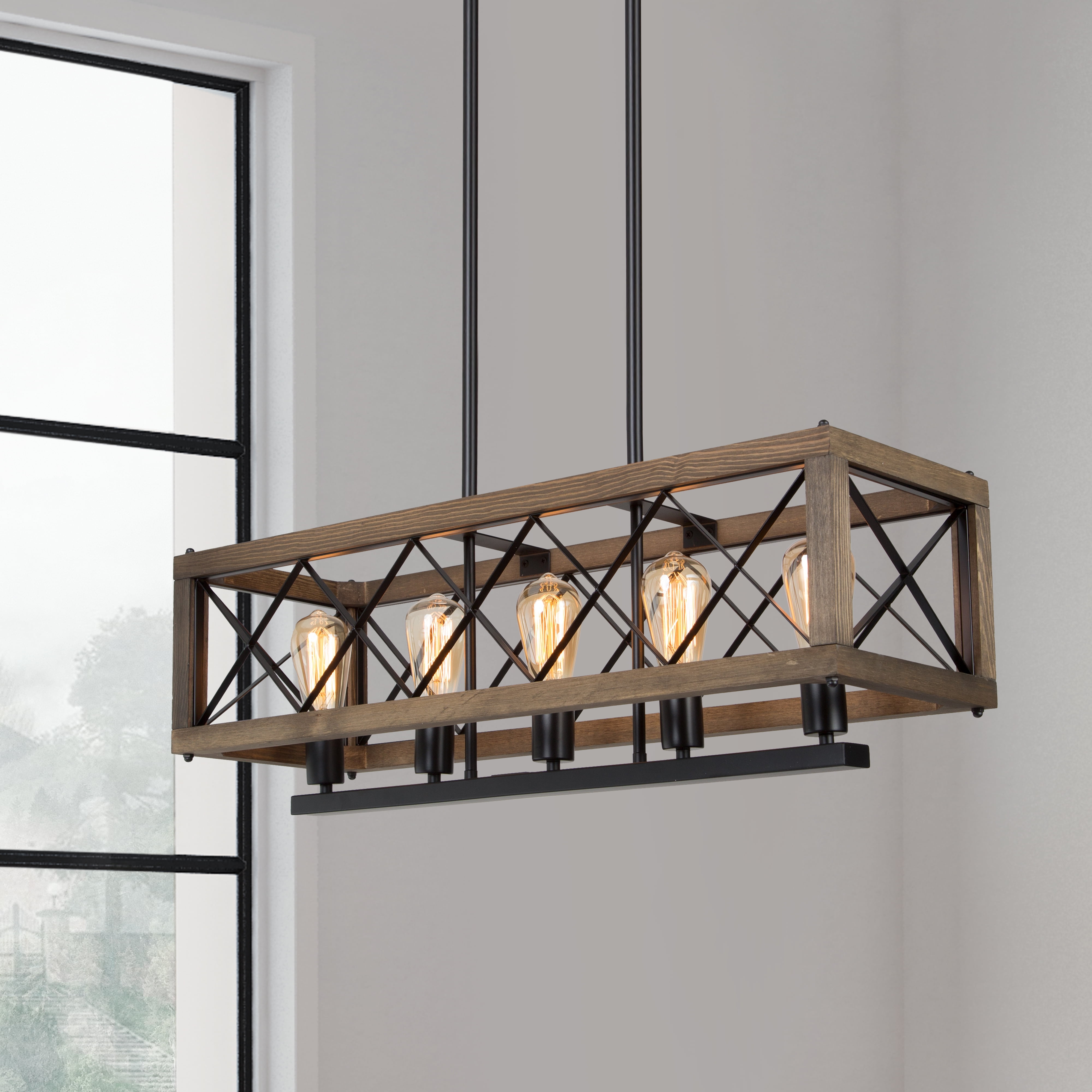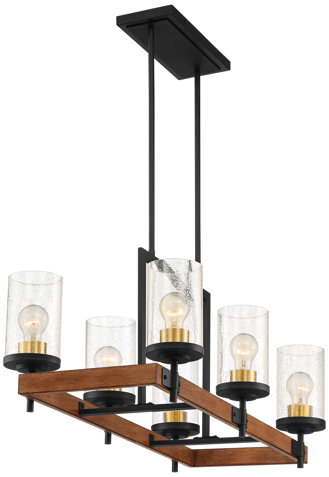 The Gray Barn Vineyard Metal and Wood 6-Light Chandelier with... Product Details. The Vineyard Metal and Wood 6-Light Chandelier features a rectangular shaped frame in warm brown wood and distressed bronze metal with seeded glass shades. This is perfect for use in a living room, dining room, or used as island lighting.