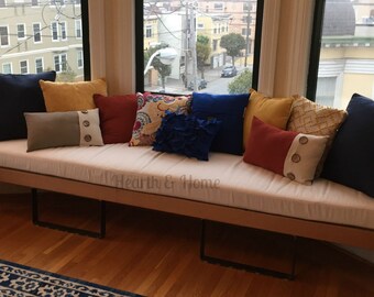 Custom Bay Window Cushions: Perfect Size & Look; Made In USA Bay Window Cushions. Create a warm and inviting space for you and your family! Our custom Bay Window Cushions are comfortable and stylish and add extra seating everyone can enjoy. We start with foam in the thickness of your choice then top it with a fluffy layer of dacron on both the top and bottom of the foam insert. The dacron wrap adds up to ...