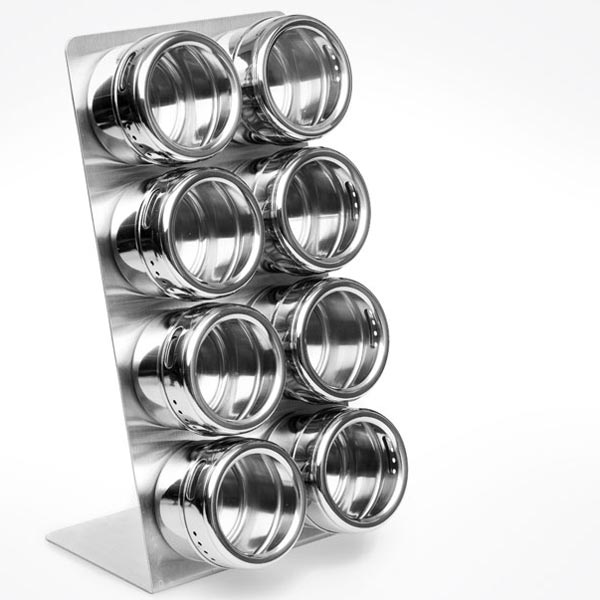 3 Piece Stainless Steel Spice Shaker Set with Powerful Magnetic Bases 3 piece Stainless Steel Grilling and BBQ Spice Shaker Set with powerful magnetic bases. Keep spices securely mounted to any steel surface. The spice you need, at your fingertips: Salt shaker, Spice grinder, and Rub shaker. Features adjustable spice grinder for coarse, medium, or finely ground pepper