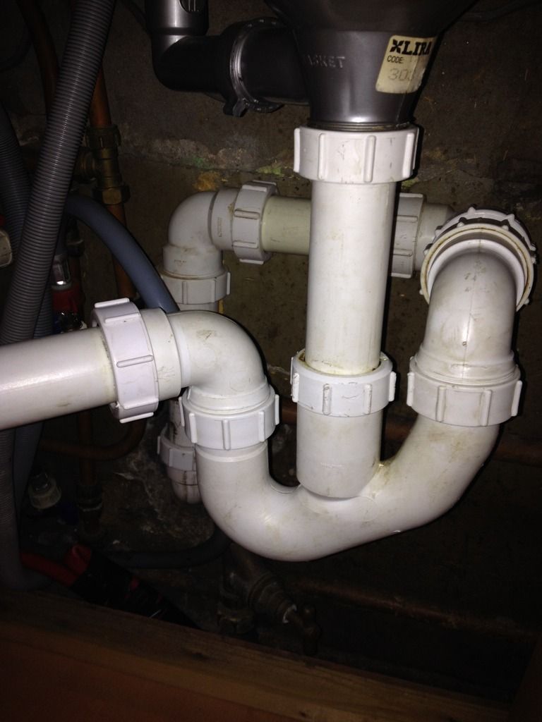 Sink fills with water when washing machine empties??? Also very slow to ... The pipework is connected as in the photos dishwasher > 0.5 sink > 1.0 sink this then goes through the wall into a u-bend and into a junction where the washing machine pipe joins it after a u-bend (also the overflow bit from the boiler, or whatever it is) this is all then plumbed into the foul 110mm pipe.