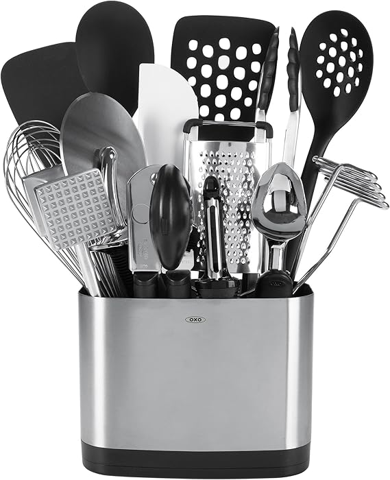 OXO Good Grips 15-Piece Everyday Kitchen Tool Set - Amazon New (4) from ₹18,630.00 FREE Delivery. Slim-lined, space-efficient utensil holder with 14 of OXO's most important everyday kitchen tools. Includes flexible turner, 12-inch tongs, square turner, spoon, slotted spoon, grater. Also includes swivel peeler, ice cream scoop, potato masher, can opener, balloon whisk, spatula, meat tenderizer, pizza ...