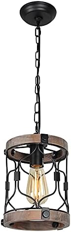 Small Farmhouse Rustic Pendant Light Fixture for Kitchen Island, Entryway, Dining Room, Foyer, Hallway, Solid Wood Black Metal Cage Shade Cylindrical ...