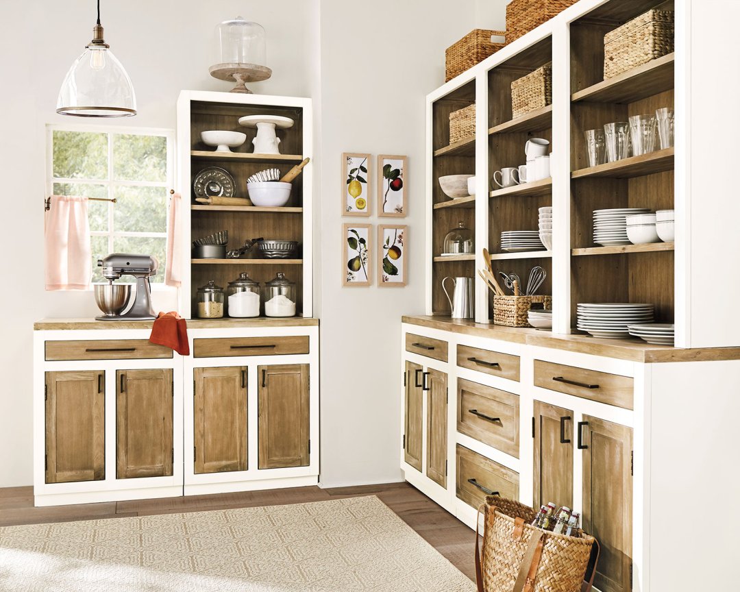 21 Beautiful Open Kitchen Shelving Ideas - The Spruce Floating shelves in a farmhouse-style kitchen are often made from stained or reclaimed wood, which looks great in most spaces. These wooden shelves are given some additional rustic flair with wire hooks supporting each shelf, ultimately supported by the exposed wooden beam ceiling above. Continue to 2 of 21 below. 02 of 21