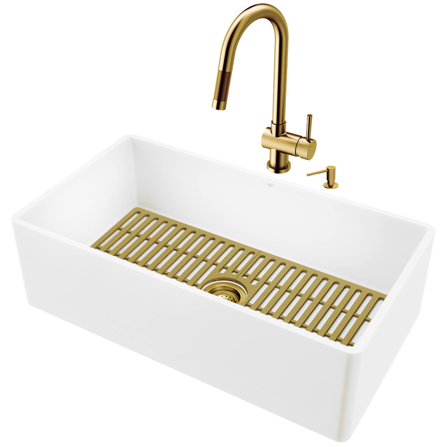 33 Inch VIGO Single Bowl Matte Stone Farmhouse Flat Apron Front Undermount Kitchen Sink in Matte White with Gramercy Pull-Down Kitchen Faucet in Matte ...