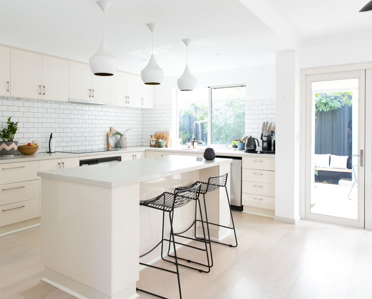 32 Stunning L-Shaped Kitchen with Island Ideas That Pop - Soul & Lane This L-shaped kitchen features white walls and cabinets above a brown countertop. A white island is placed on the warm wood floor. Three wood barstools are shoved under the island in front of a long console table. White floating shelves filled with an assortment of plants, plates, and containers hang above the table.